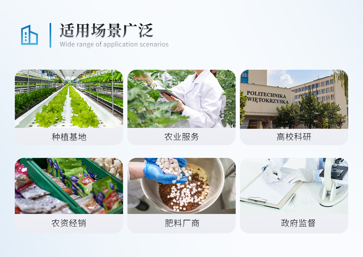 | 土壤养分:● 铵态氮、速效磷、速效钾、水份、有机质、酸碱度(pH试纸法)等项; | 肥料养分:● 单质化肥中的氮、磷、钾; ● 复(混)合肥及尿素中的铵态氮、磷、钾; ● 有机肥中速效氮、速效磷、速效钾、全氮、全磷、全钾、pH、有机质等。 |