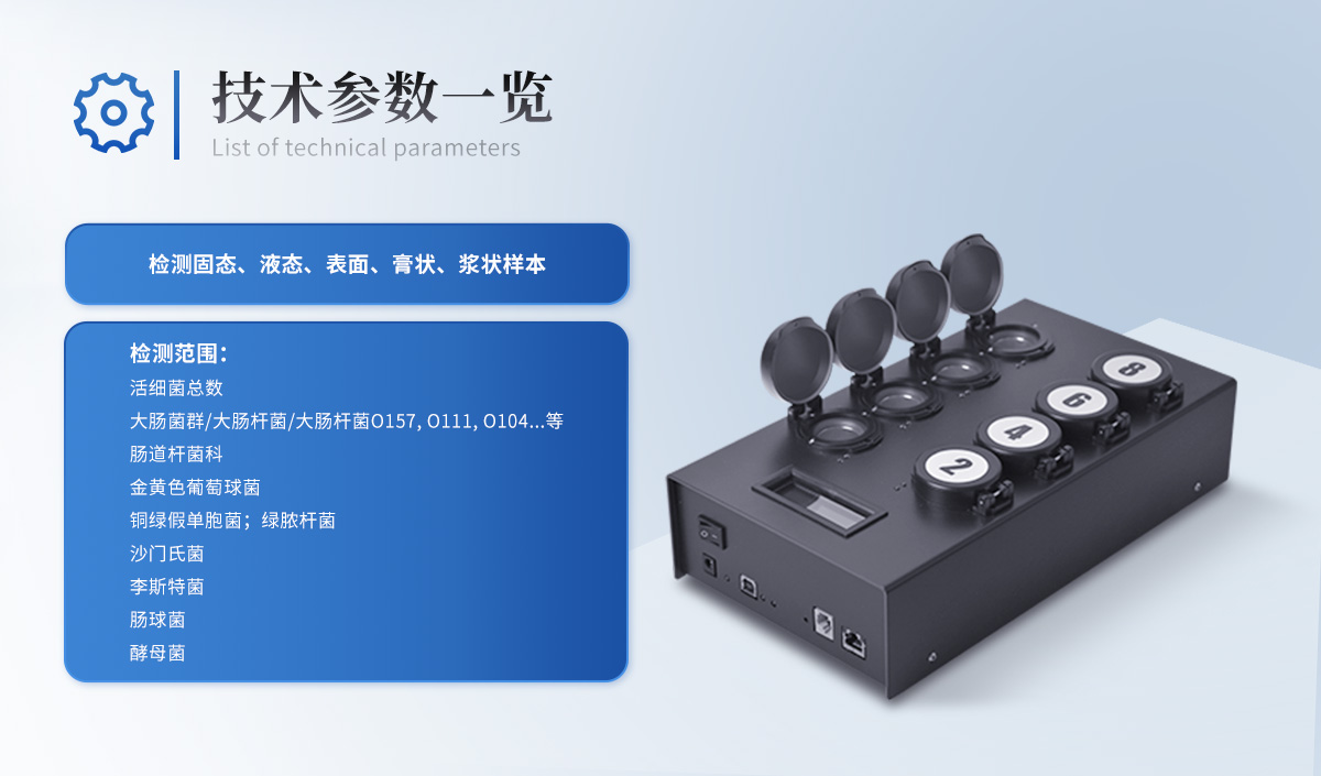 | 可实现活菌总数、嗜常温菌总数(22℃)、嗜常温菌总数(30℃)、大肠杆菌O157:H7、大肠菌群、沙门氏菌、单核增生李斯特菌、金黄色葡萄球菌、阪崎肠杆菌、肠球菌、乳杆菌、酵母菌、真菌、副溶血性弧菌等微生物快速检测; | 检测原理:融合定性培养、代谢物显色技术、颜色实时监测传感技术与一体; | 技术优势:样品无需前处理、无需提取,即可直接检测; | 传感器:三色(或以上)颜色传感器; | 内置3组模块,每个模块独立控温:温度范围:15~65℃,控温精度:±1℃ ; | 共18个检测通道,可同时检测18个样品,每个通道均可检测任意项目; | 系统运行环境:安卓/windows; | 箱体:便携一体式手提箱设计,自带手柄方便携带,防水、抗压、抗震; | 显示:≥10寸电容式液晶触摸屏; | 打印机:内置热敏打印机,支持背胶打印纸; | 通讯方式:wifi模块、蓝牙模块等多种通讯方式; | 运行内存:≥2GB; | 存储空间:≥32G; | 系统重量 ≤ 8kg | 工作电源:自带安全稳定的电源适配器,内置可充电式备用锂电池,市电断电后自动报警,并可维持正常工作半小时以上; | 具光波防护安全装置,操作中如果翻盖则自动暂停分析; | 操作简捷:整个过程在一个单次用量分装的预制反应瓶中即可完成,仅需加样操作,无需其他任何移液操作,也无需前处理; |