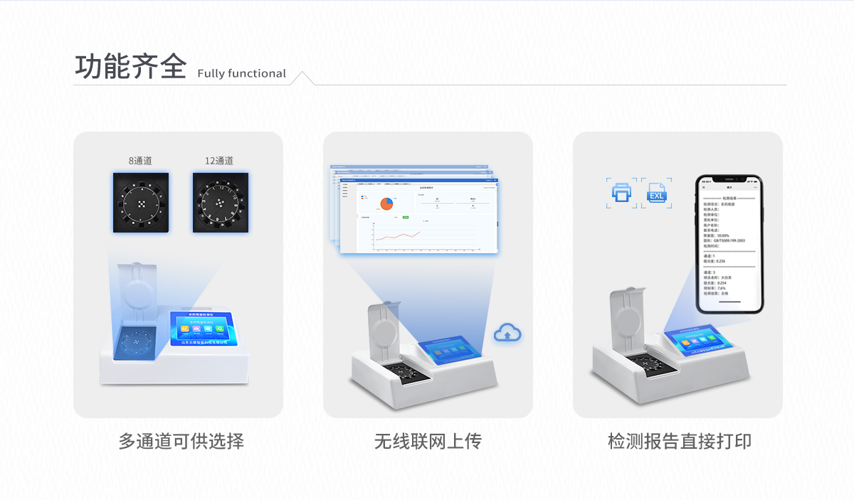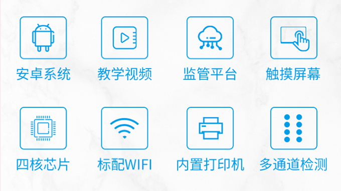 | 安卓智能操作系统,采用更加**和人性化操作,仪器具有无线联网上传功能,快速上传数据,进行数据统计和分析。 | 智能化程度高,仪器具有自检功能:具有开机自检和调零功能,具有自动检测重复性功能;同时,检测完成可自动打印检测报告和二维码。手机扫码可显示出详细检测信息。 | 仪器带有监管平台,数据可局域网和互联网数据上传,检测结果直接传至食品安全监管平台。进行区域食品安全监管及大数据分析处理与数据统计,检测区域食品安全长短期动态,达到食品安全问题预估、预警 。 | 样品处理简单省力,整体操作快速、安全、便捷。 | 仪器具有自身保护功能,可设置用户名及密码,防止非工作人员操作等。 | 内置强大的数据库,可在仪器上直接选择样品名称、检测指标、送检单位等信息,也可在仪器上直接编辑录入样品名称、检测指标、送检单位等信息并保存进样品数据库,方便后期操作调取使用。 | 仪器具有重新校准、锁定、恢复出厂设置功能。 |