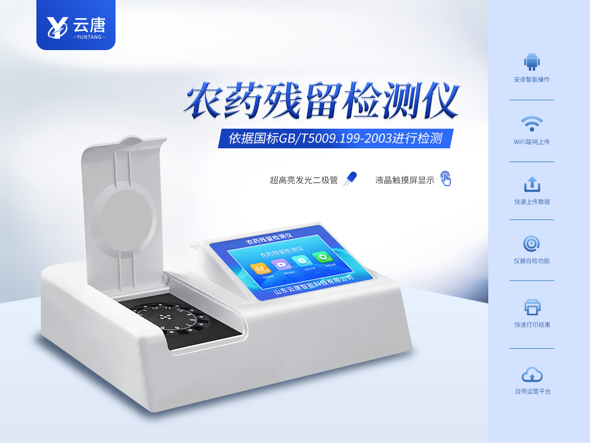 山东云唐智能科技有限公司生产的农药残留检测仪广泛应用于主要用于蔬菜、水果、茶叶、粮食、农副产品等食品中农药残留的快速检测,依据国标GB/T5009.199-2003进行检测,适用于果蔬茶生产基地以及农贸批发销售市场现场检测,餐馆、学校、食堂、家庭果蔬加工前的安全速测等。