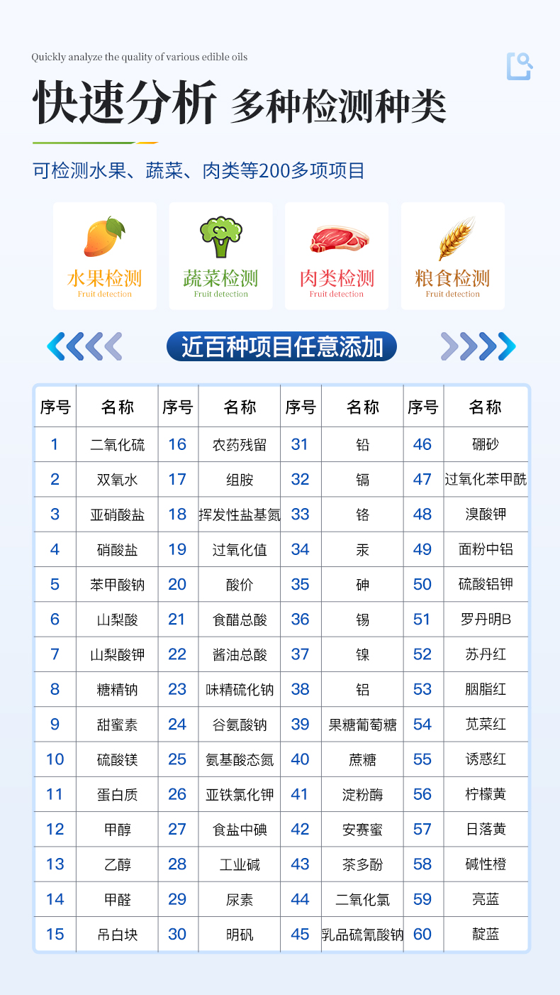 高精度食品安全检测仪可快速检测60多项目,包含:滥用食品添加剂、非食用化学物质、农药残留、重金属含量、病害肉成分、营养强化剂、化学类残留、食用油脂检测、水酒饮品分析、调味品成分、食用色素等现场的定性定量检测。