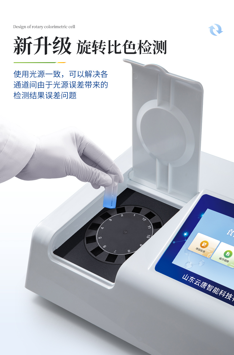 4、检测通道:12通道;采用精密旋转比色池设计,使用同芯片同光源校准精度,解决不同光源之间的误差值,更加准确**。