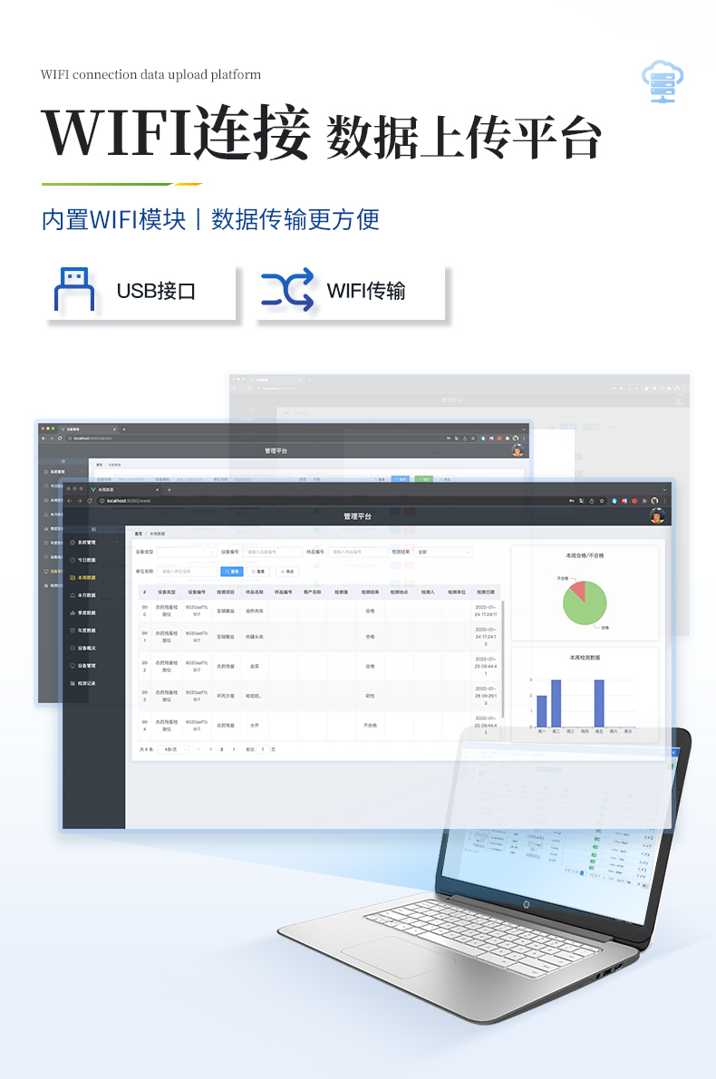 8.3、数据监管系统:同步对接监管平台,数据可局域网和互联网数据上传,检测结果可选择直接传至食品安全监管平台。进行区域食品安全监管及大数据分析处理与数据统计,检测区域食品安全长短期动态,达到食品安全问题预估、预警。
