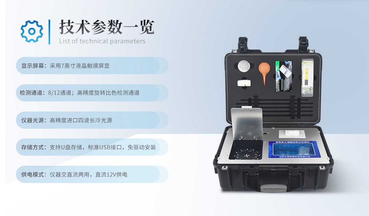 配套齐全:该仪器集药、器、仪为一体,携带方便,相当于一个小型移动实验室,无需用户自配附件,亦可灵活野外流动测试。适于农业服务部门或农资经销商、合作社、肥料厂商、大种植户测土施肥和鉴别肥料真假。
