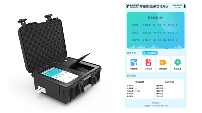 山东云唐智能科技有限公司生产的高智能食品安全检测仪为集成化食品安全快速检测分析设备,采用台式一体化设计,可快速检测200多种食品安全项目,包含非食用化学物质、滥用食品添加剂、农药残留、兽药残留、重金属、病害肉、营养强化剂、抗生素类残留、激素类残留、真菌毒素类残留、化学类残留等项目的定性定量检测。该高智能食品安全检测仪为集成化食品安全快速检测分析设备,目前已于食药监局、卫生部门、高教院校、科研院所、农业部门、养殖场、屠宰场、食品肉产品深加工企业及检验检疫部门等单位广泛使用。