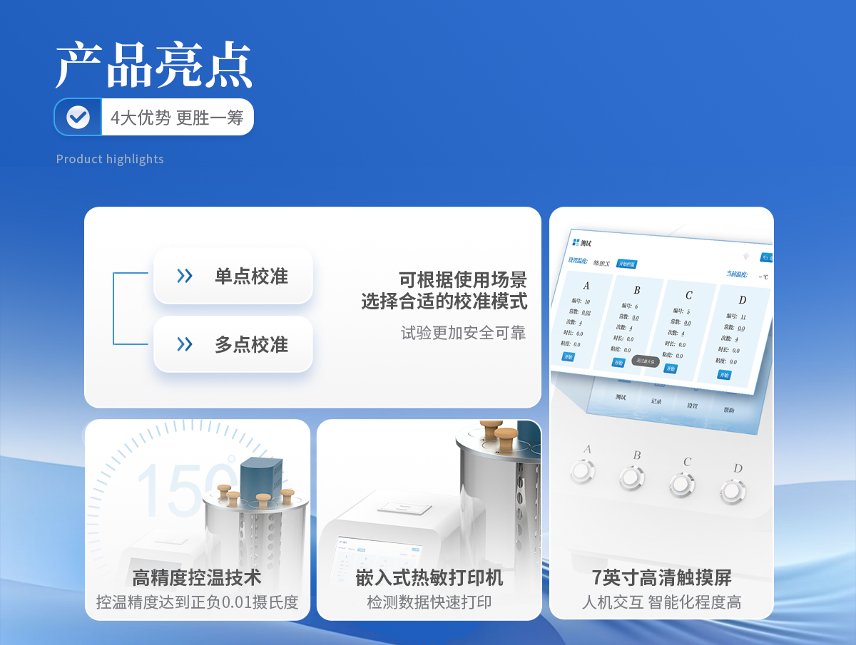测试方法:品氏、乌氏两种。 温度范围:室温~+150°C精度±0.01°C。 温度传感器:德国A级Pt100不锈钢探头,内置温度校正,检测结果可靠。 加热方式:电加热单元,**加热功率1600W。 显示:7寸工业彩色触摸屏。 温度校正:单点校准、多点校准可选。 数据存储:10000组测试结果。 尺寸:530*310*232.5(mm) 工作环境: 温 度:10-35℃ 湿 度:相对湿度不大于50% 工作电压:220V 50HZ