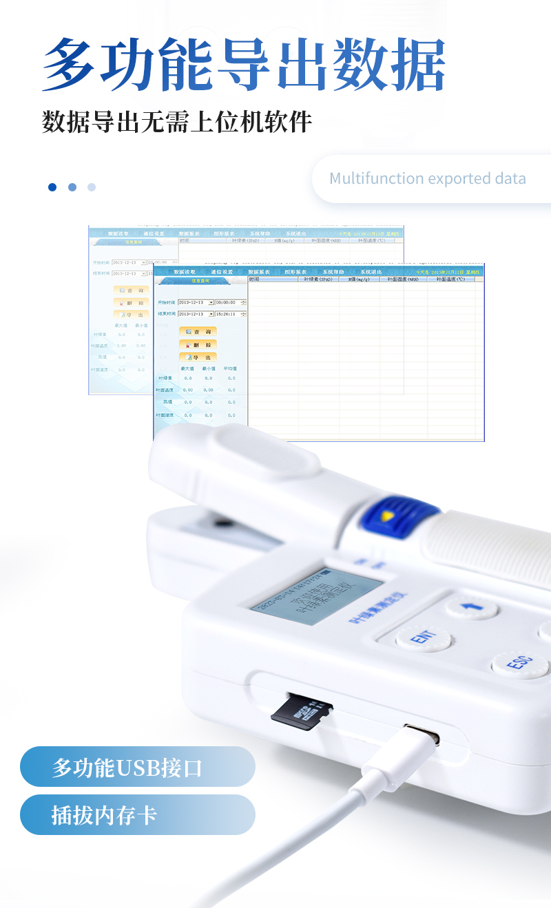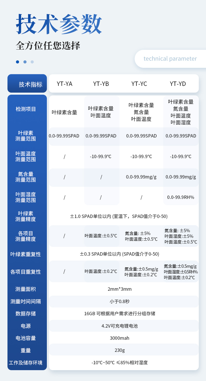 | 测量范围 0.0-99.9 SPAD | 测量面积 2mm*2mm | 测量精度 ±1.0 SPAD单位以内 (室温下,SPAD值介乎0-50) | 重复性 ±0.3 SPAD单位以内 (SPAD值介乎0-50) | 测量时间间隔 小于3秒 | 数据存储容量 2GB | 电源 4.2V可充电锂电池 | 电池容量 800mah | 重量 250g | 外形尺寸 140×85×45mm(长×宽×高) | 工作及存储环境 0℃-50℃;85%相对湿度 |