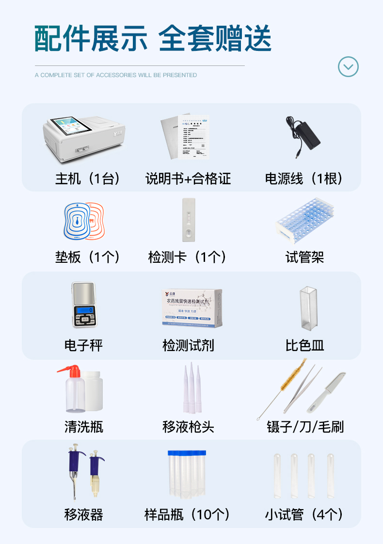 | 食品添加剂:二氧化硫、双氧水、亚硝酸盐、硝酸盐、苯甲酸钠、山梨酸钾、糖精钠、甜蜜素、木耳硫酸镁等 | 有毒有害物质:甲醛、吊白块、硼砂、过氧化苯甲酰、溴酸钾、罗丹明B、三聚氰胺、苏丹红、工业碱、尿素、明矾等 | 果蔬:农药残留(酶抑制率法) | 病害肉:组胺、挥发性盐基氮 | 重金属含量:铅、镉、铬、汞、砷、锡、镍、铝等 | 水酒饮品分析:酒中甲醇、乙醇、乳品及牛奶中蛋白质 | 调味品成分: 食醋的总酸、酱油的总酸、芝麻油纯度、谷氨酸钠、酱油氨基酸态氮、食盐中亚铁氰化钾、食盐中碘等 | 食用色素类:红色色素(胭脂红、苋菜红、苋菜红)、黄色色素(柠檬黄、日落黄)、蓝色色素(亮蓝)等 | 蜂蜜成分:果糖和葡萄糖、蔗糖、淀粉酶、酸度等 | 食用油脂:过氧化值、酸价等 |
